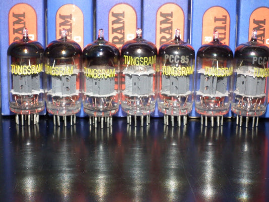 PCC85 Tungsram Austria Platinum Matched Pair NOS NIB Thick Getter late 50s NoL