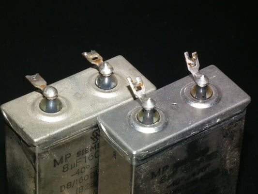 Two vintage Siemens PIO capacitors 8 uF 160V Klangfilm tube audio Glass End Seal