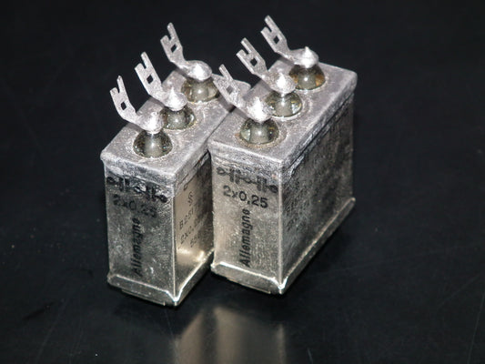 Two vintage Siemens PIO capacitors 2x2 uF 160V Klangfilm Made in West Germany