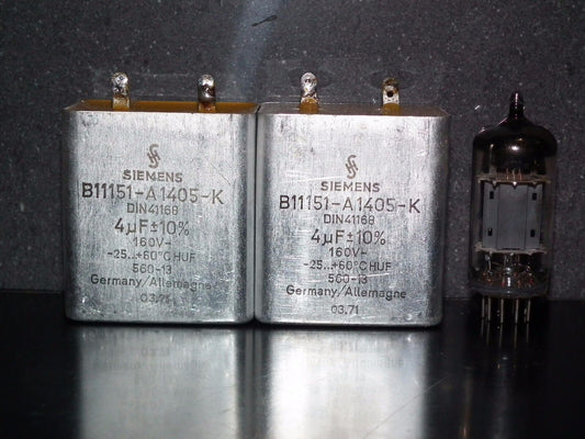 Two vintage Siemens PIO capacitors 4 uF 160V Klangfilm Made in Germany 1971 4mfd