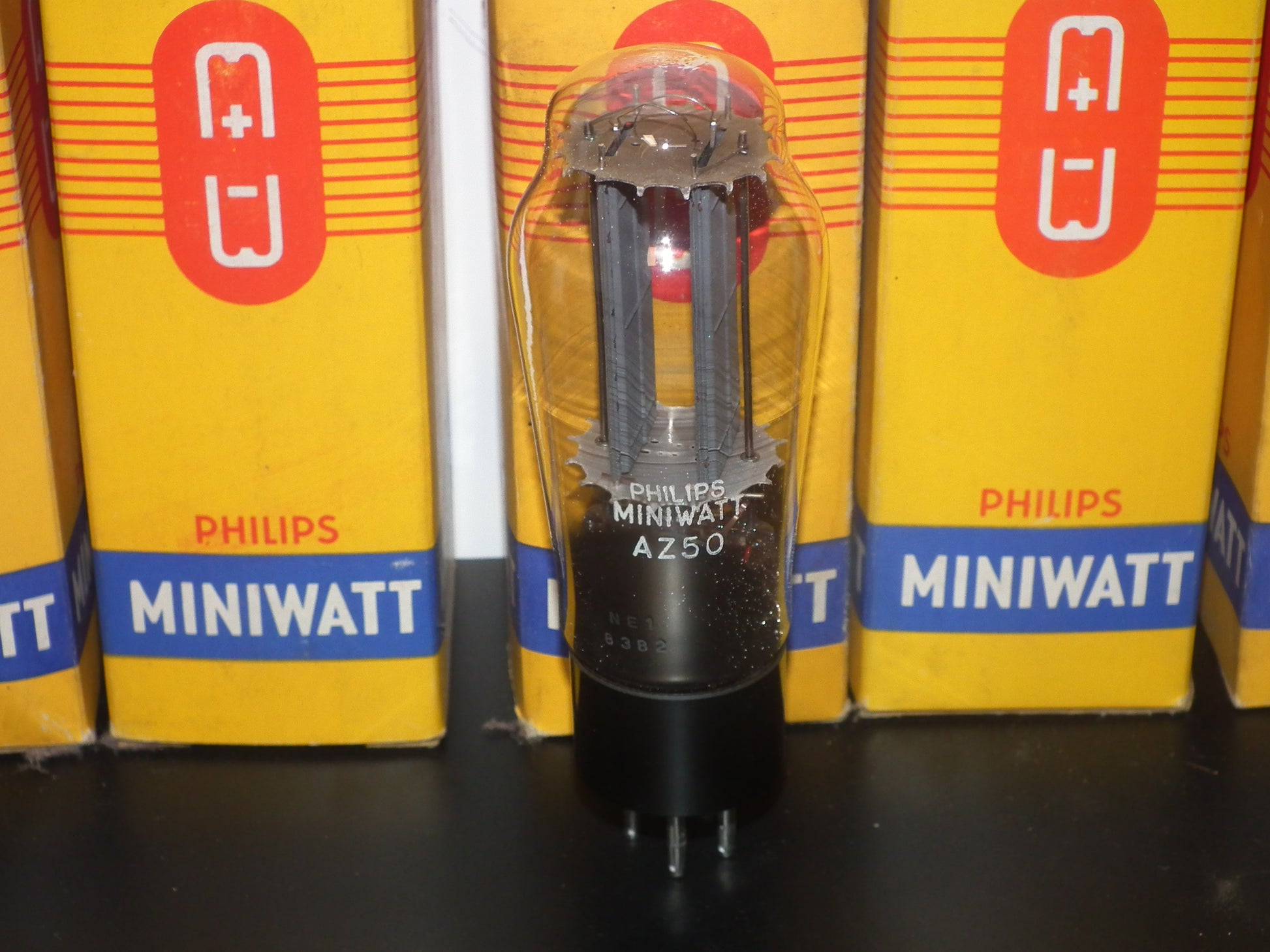 AZ50 Mullard Philips rectifier NOS NIB, dual OO getter, Blackburn 1963