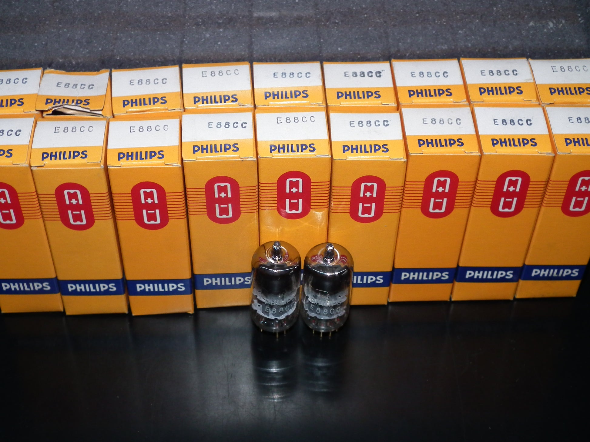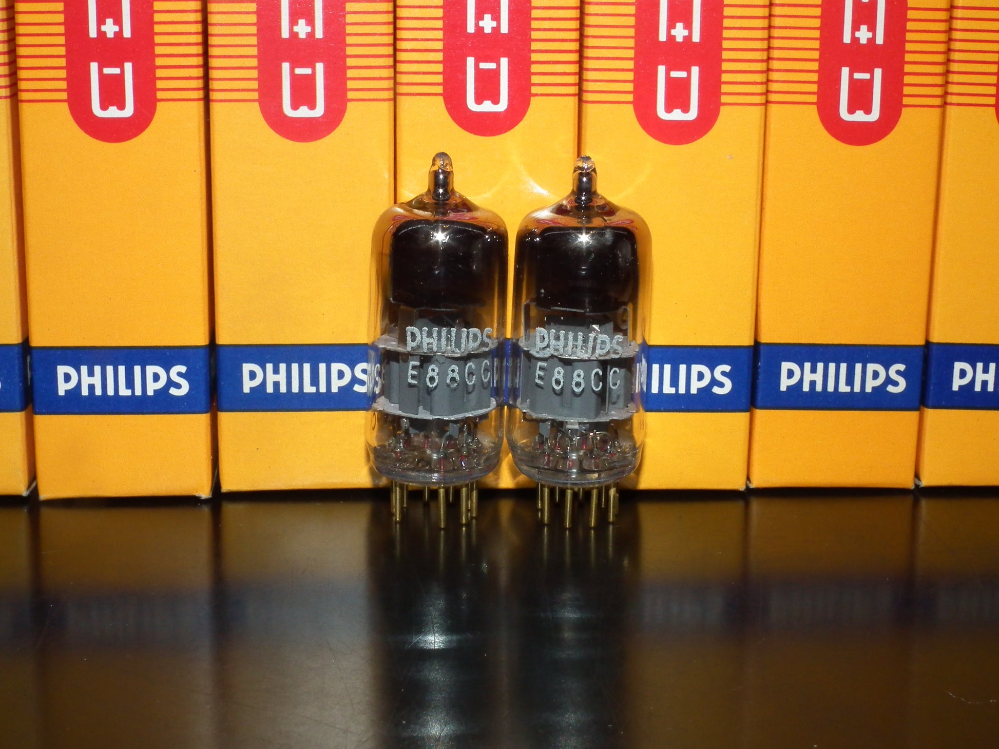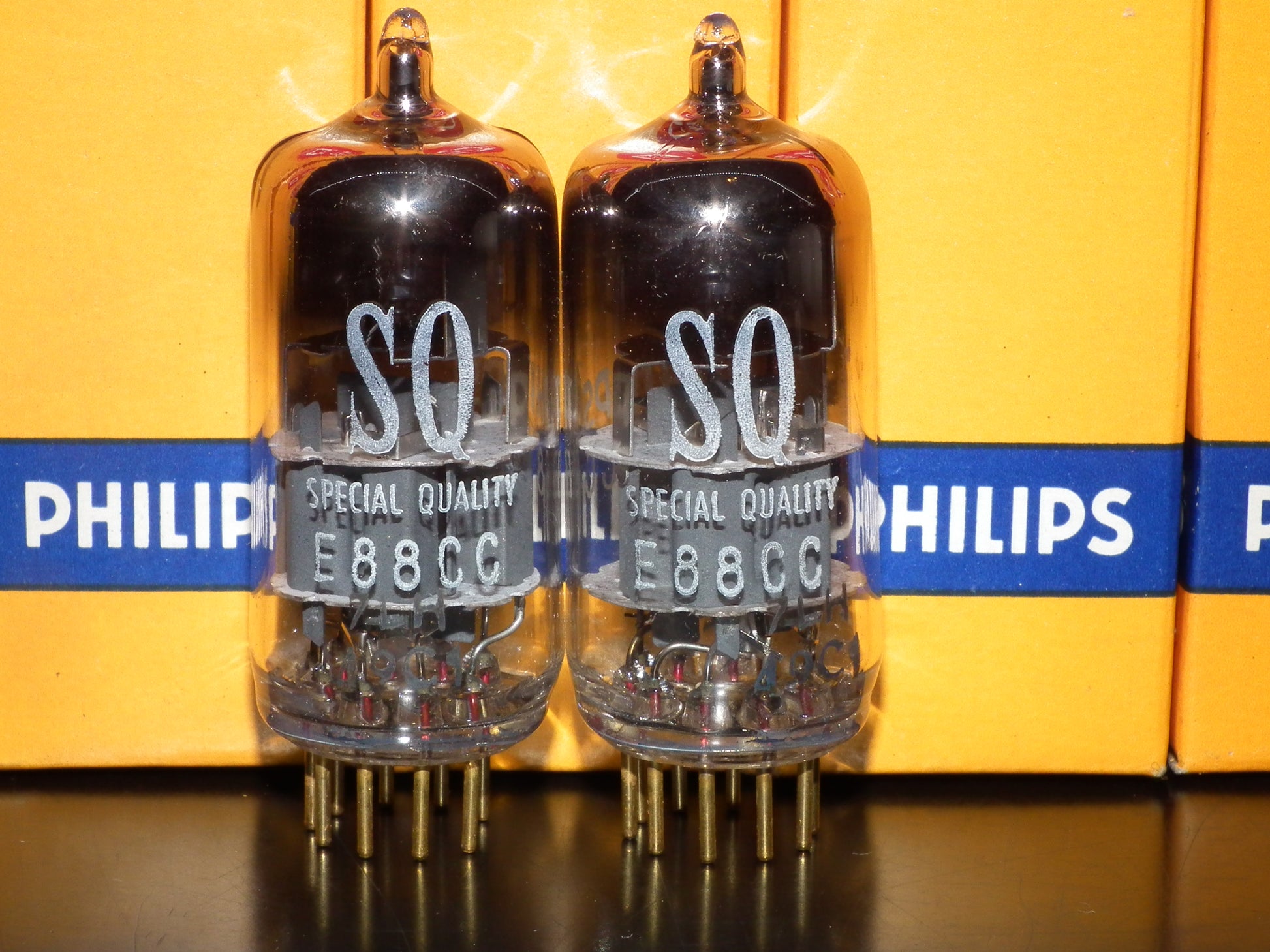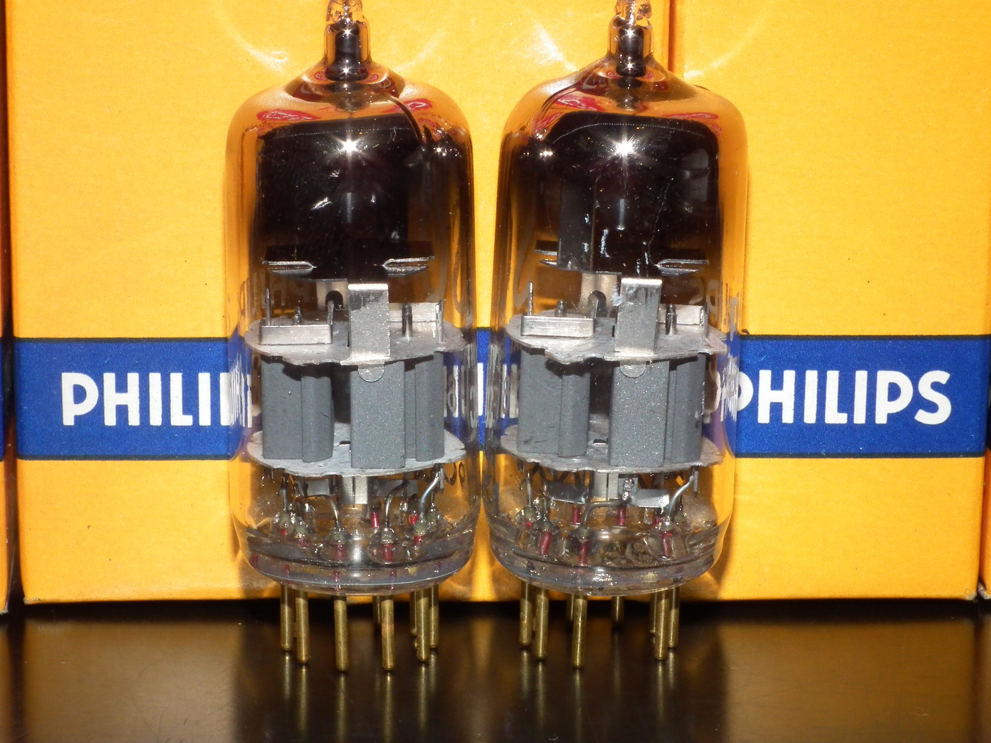 New in original boxes, gold pins, the same codes, gray electrostatic shield, double stage ring getter, made in Heerlen Holland. These are real PHILIPS MINIWATT “S.Q.” low noise frame grid inner construction tubes made for audio, and they are really great in audio use, famous for 3D, open air, sweet highs and exceptional mids.