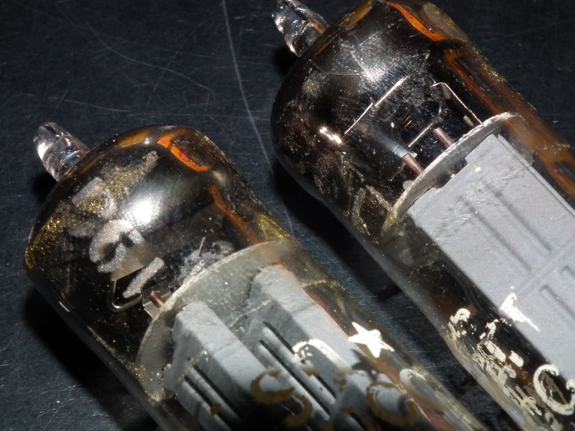 Matched pair of two E90CC tubes, which were originally produced in the Heerlen plant in late 50s by Philips. The tubes are categorized as ultra rare, featuring a crossfoil D getter and a pinched waist bulbs.