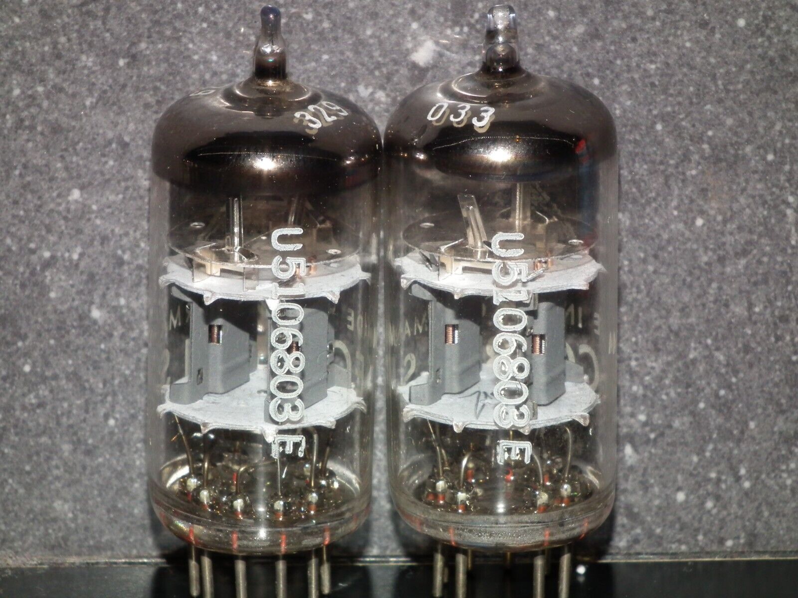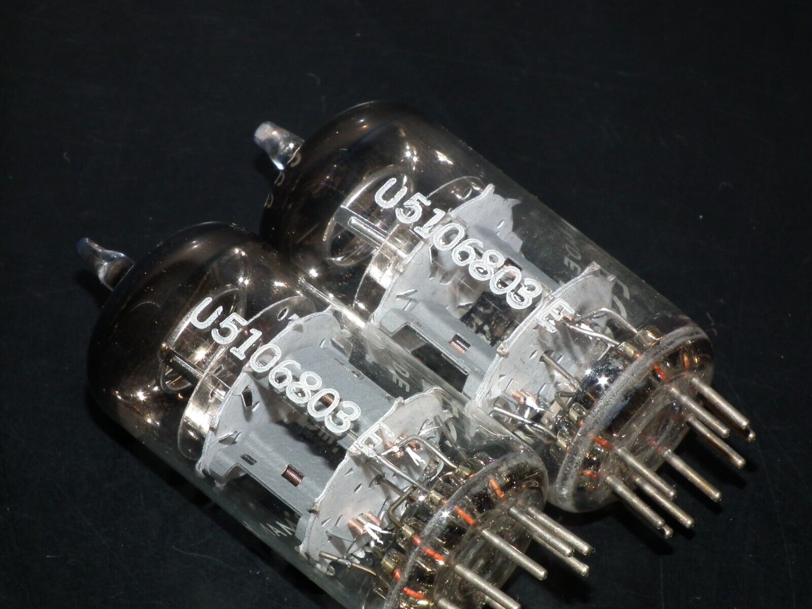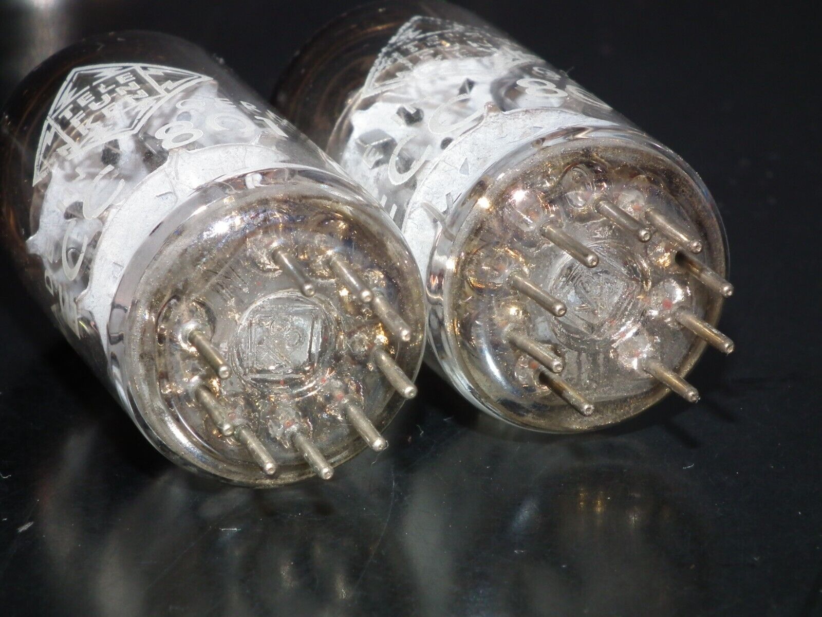 Auction is for one matched pair (2 tubes) ECC801S Telefunken ECC81 Matched pair Used Tested 100%, Ulm plant, Diamond bottom, true triple mica construction.