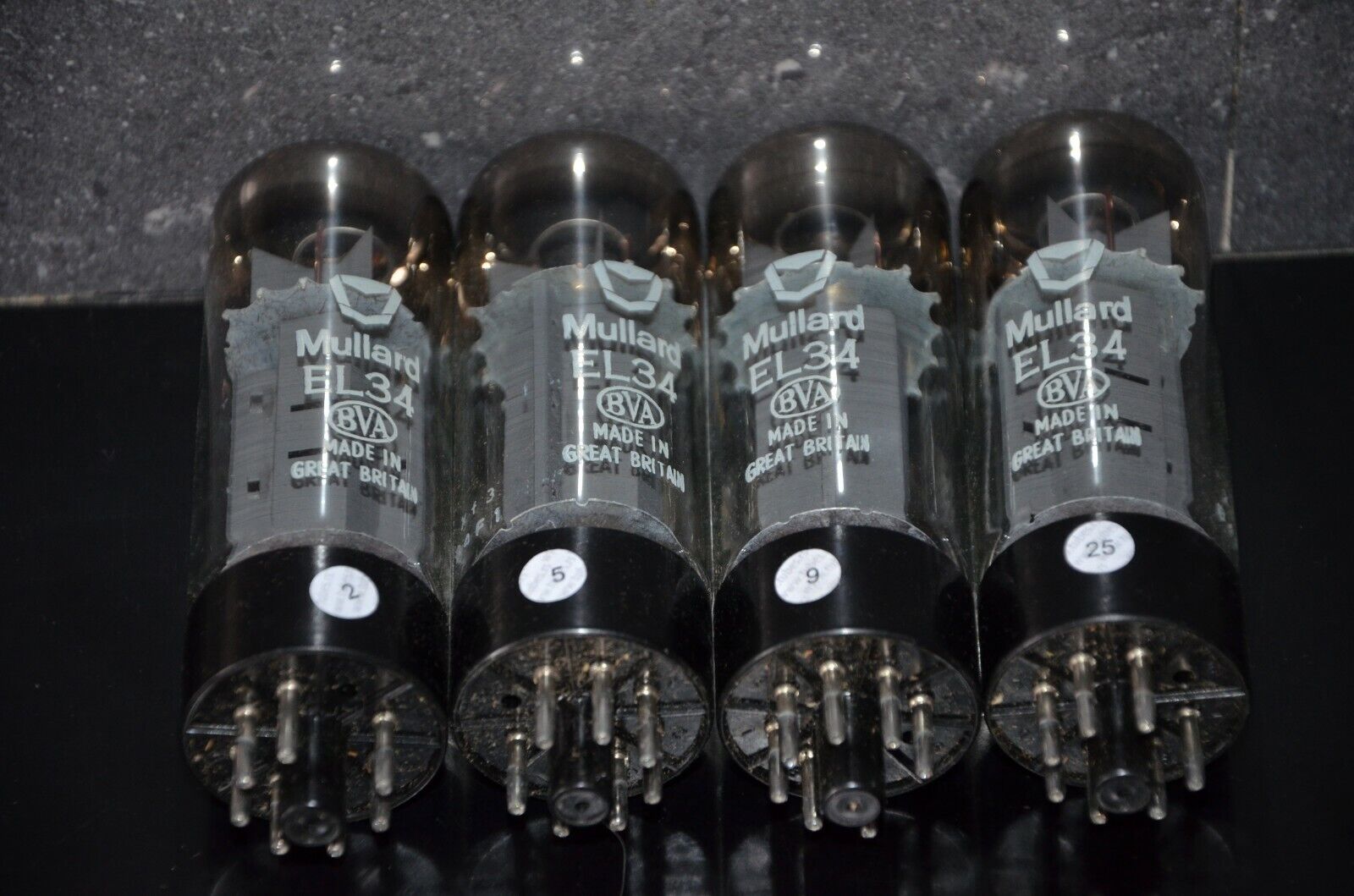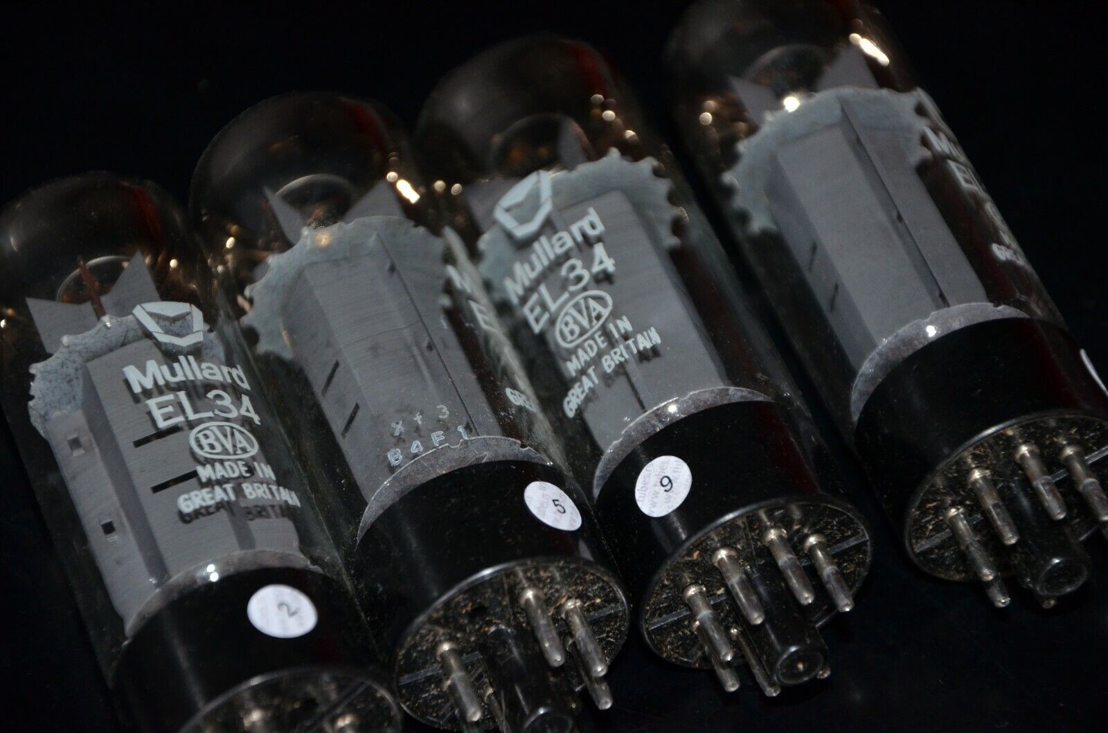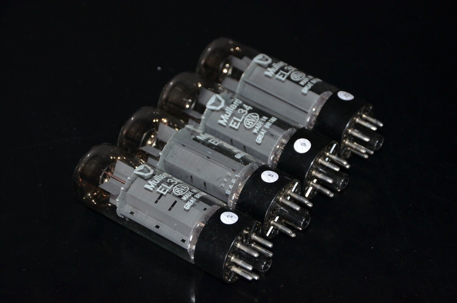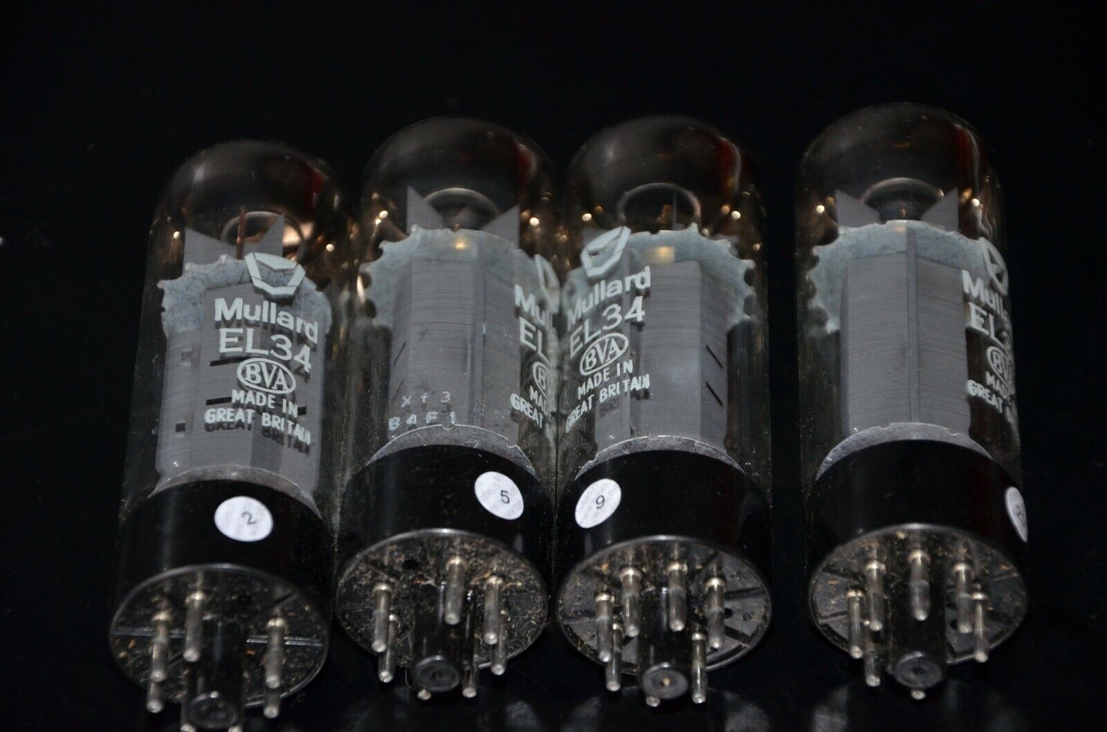 For sale is one perfectly matched quad (4 tubes) of genuine EL34 / 6CA7 made by Mullard, Blackburn in 1974, Xf3 codes.