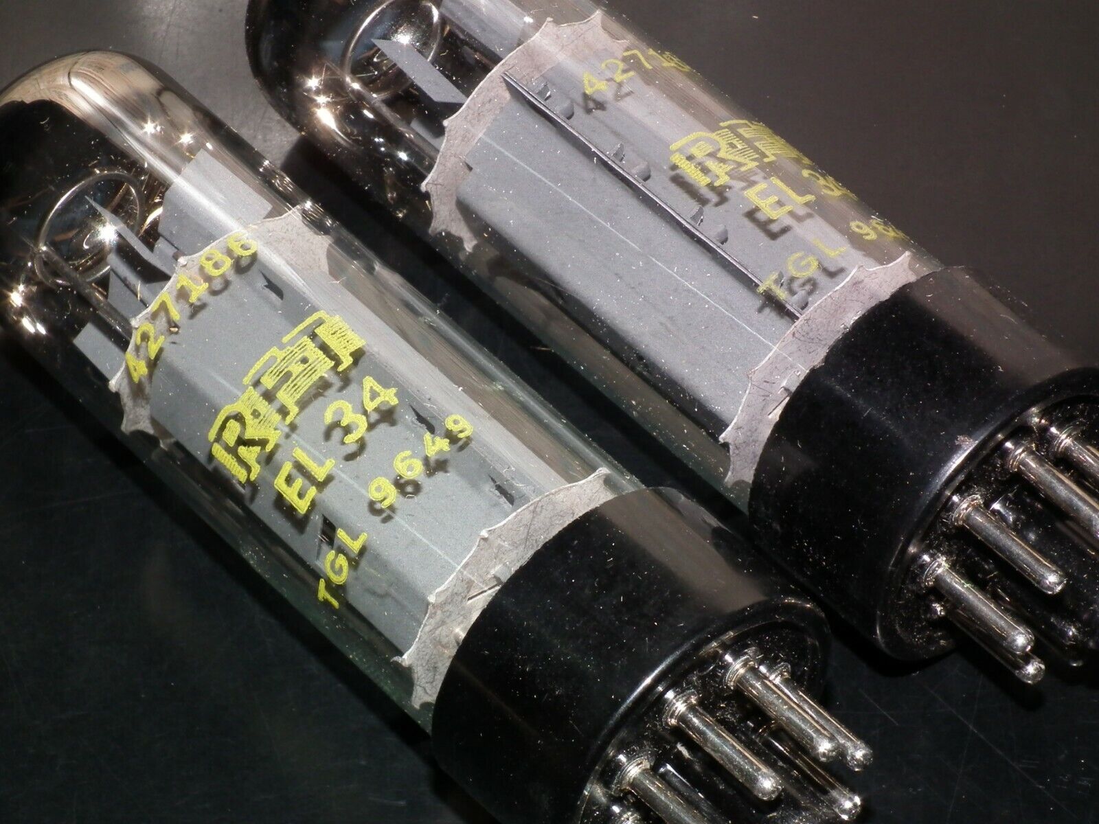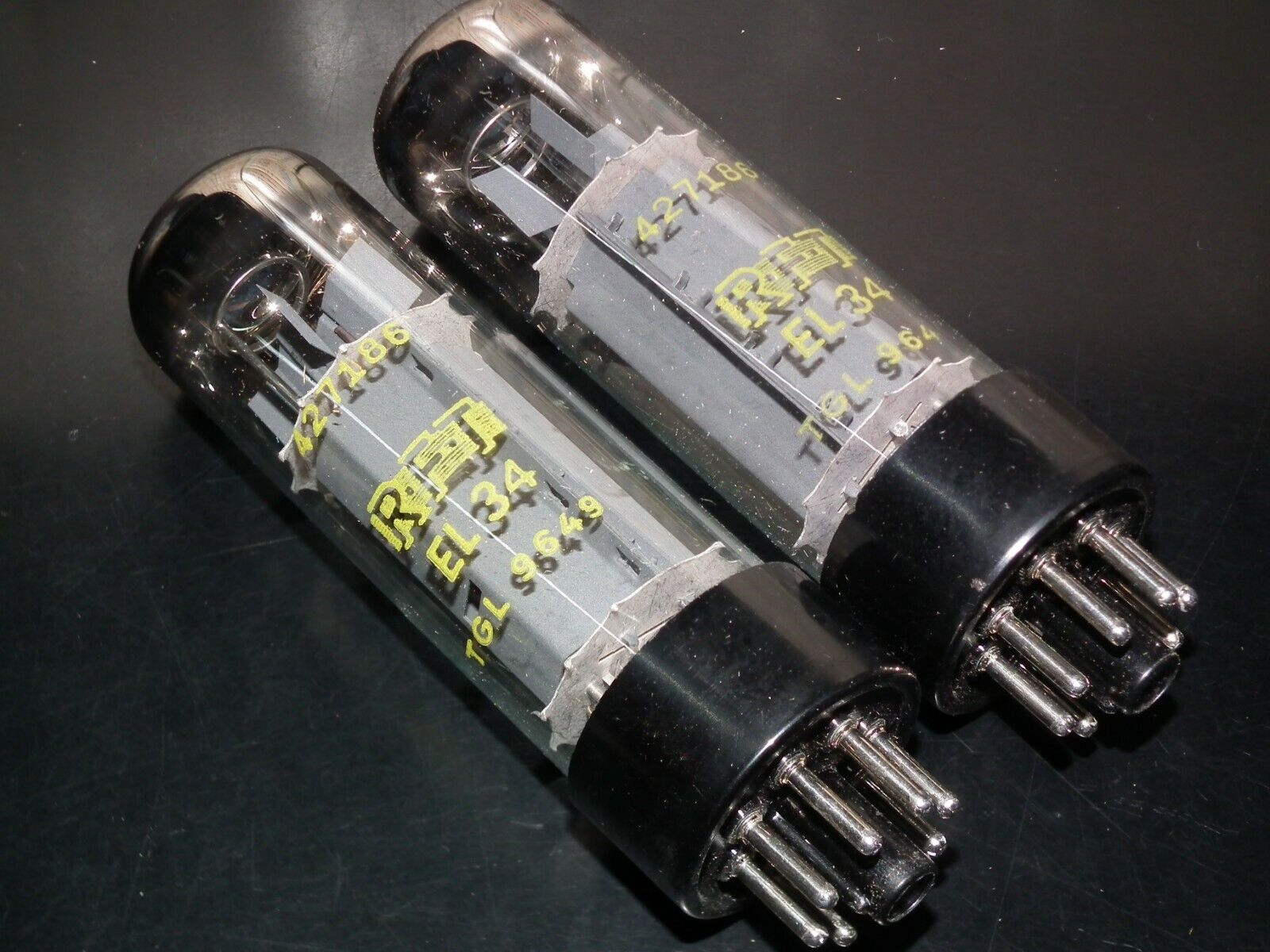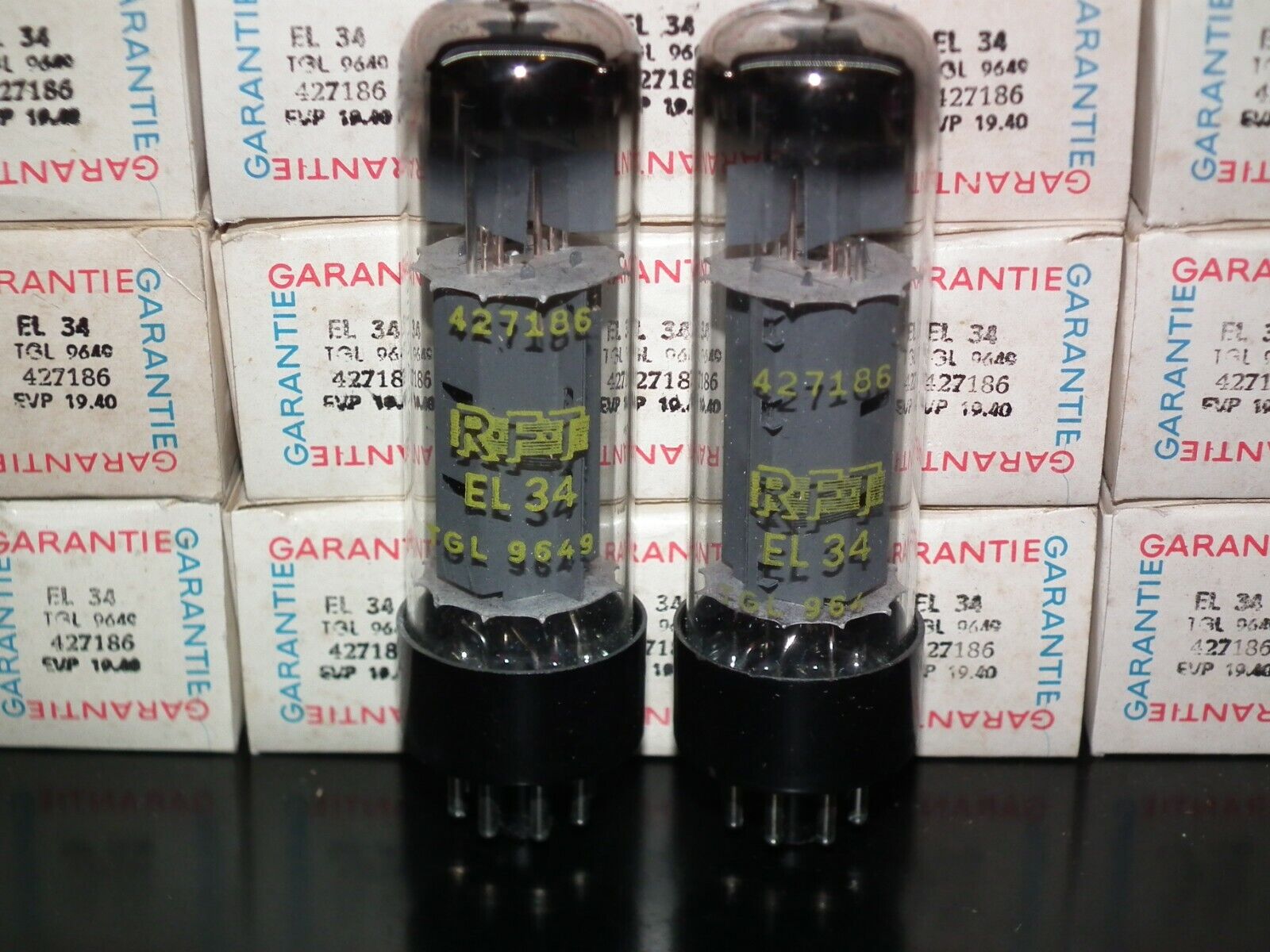 One perfectly matched pair (2 tubes) of genuine EL34 / 6CA7 made by RFT tube factory in Muhlhausen, Germany in 60s.
