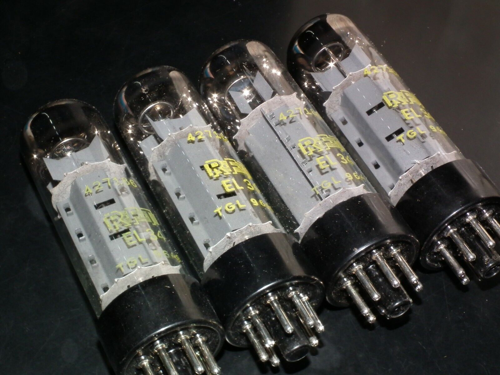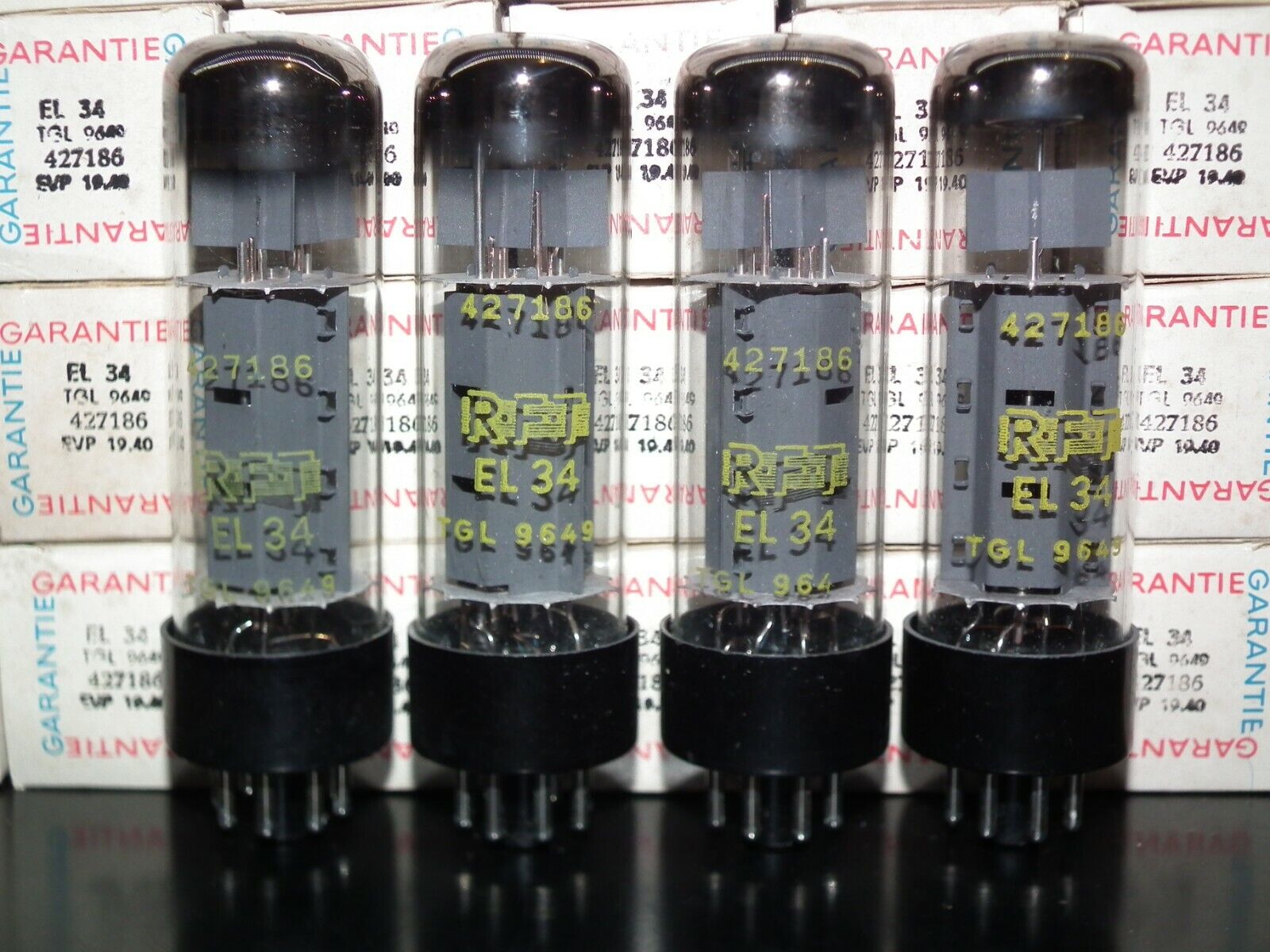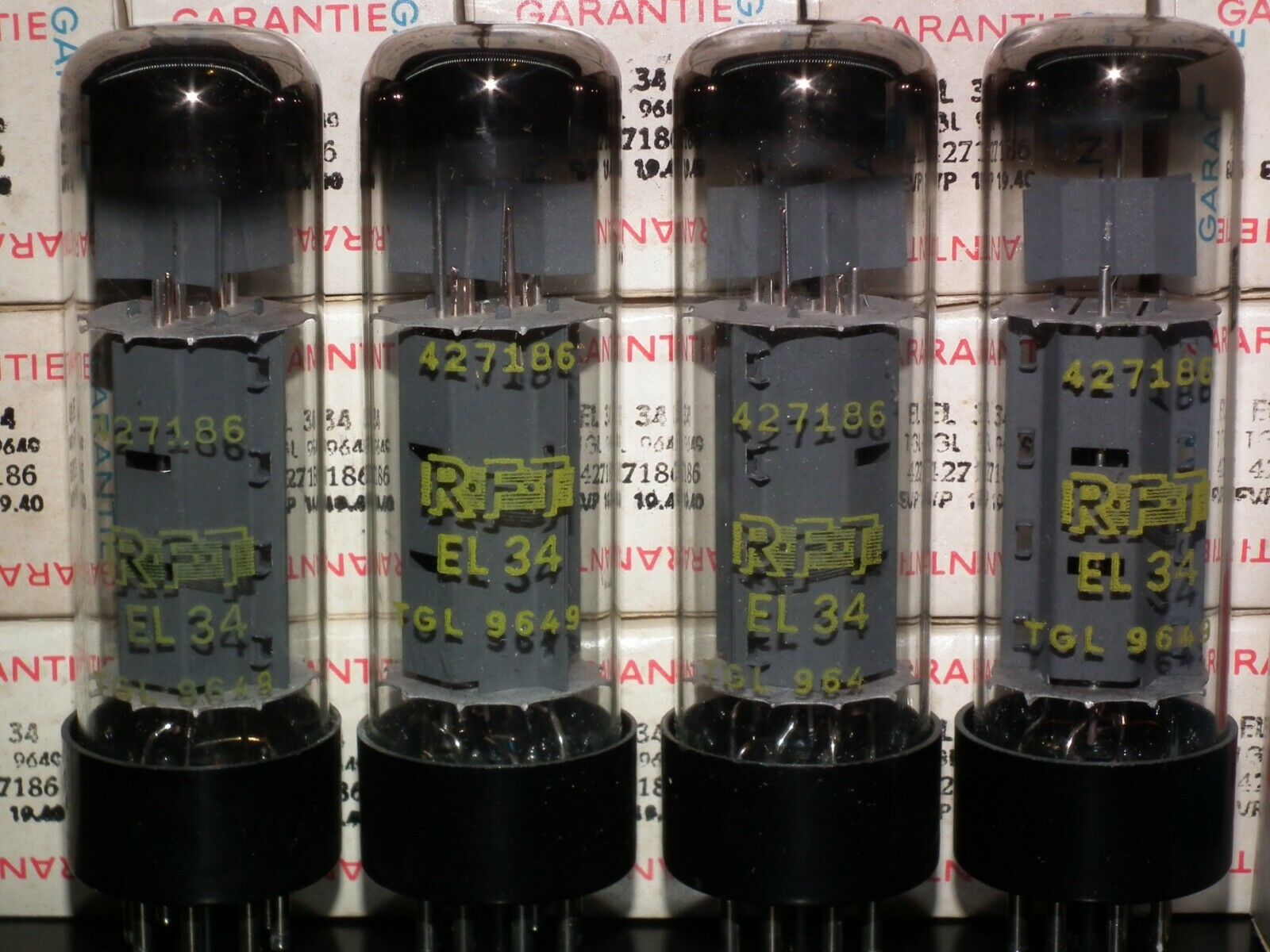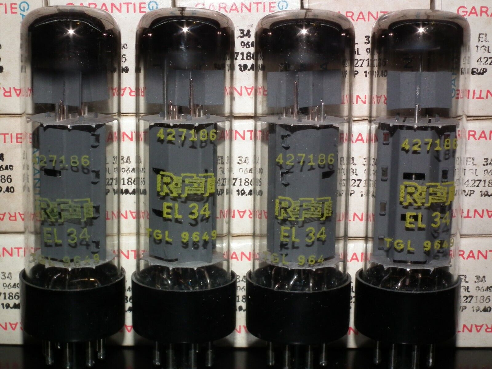 One perfectly matched quad (4 tubes) of genuine EL34 / 6CA7 made by RFT tube factory in Muhlhausen, Germany in 60s.