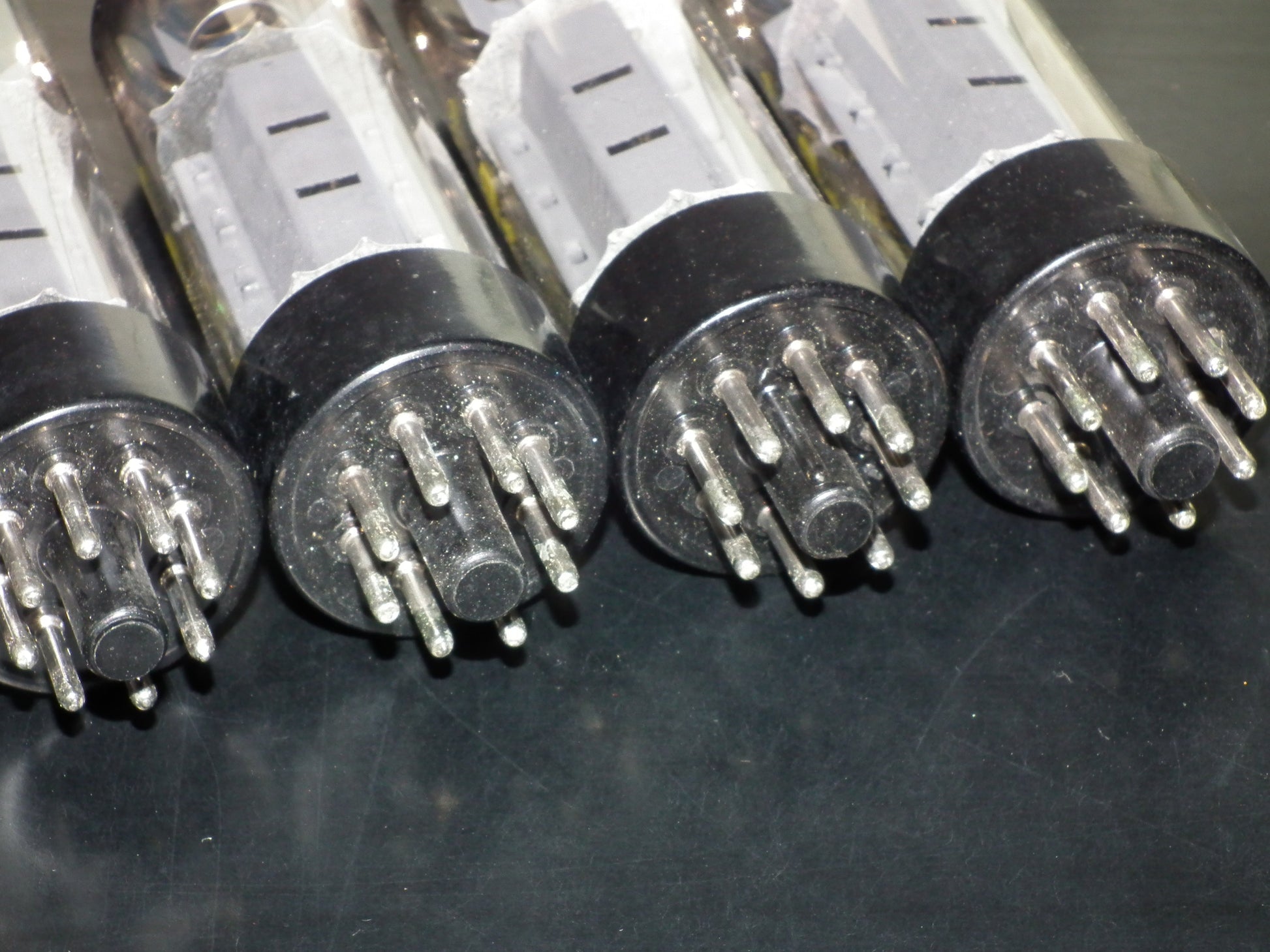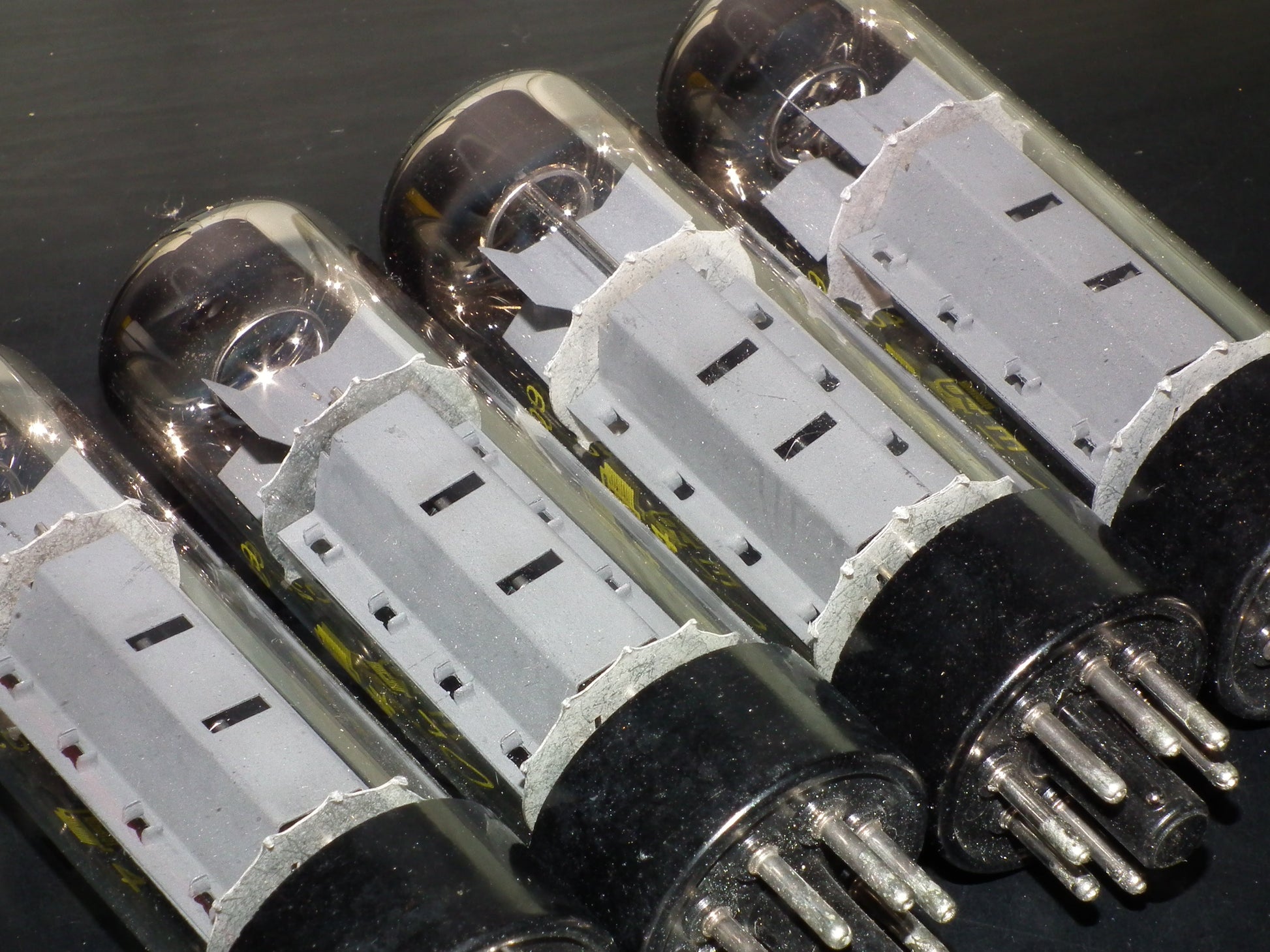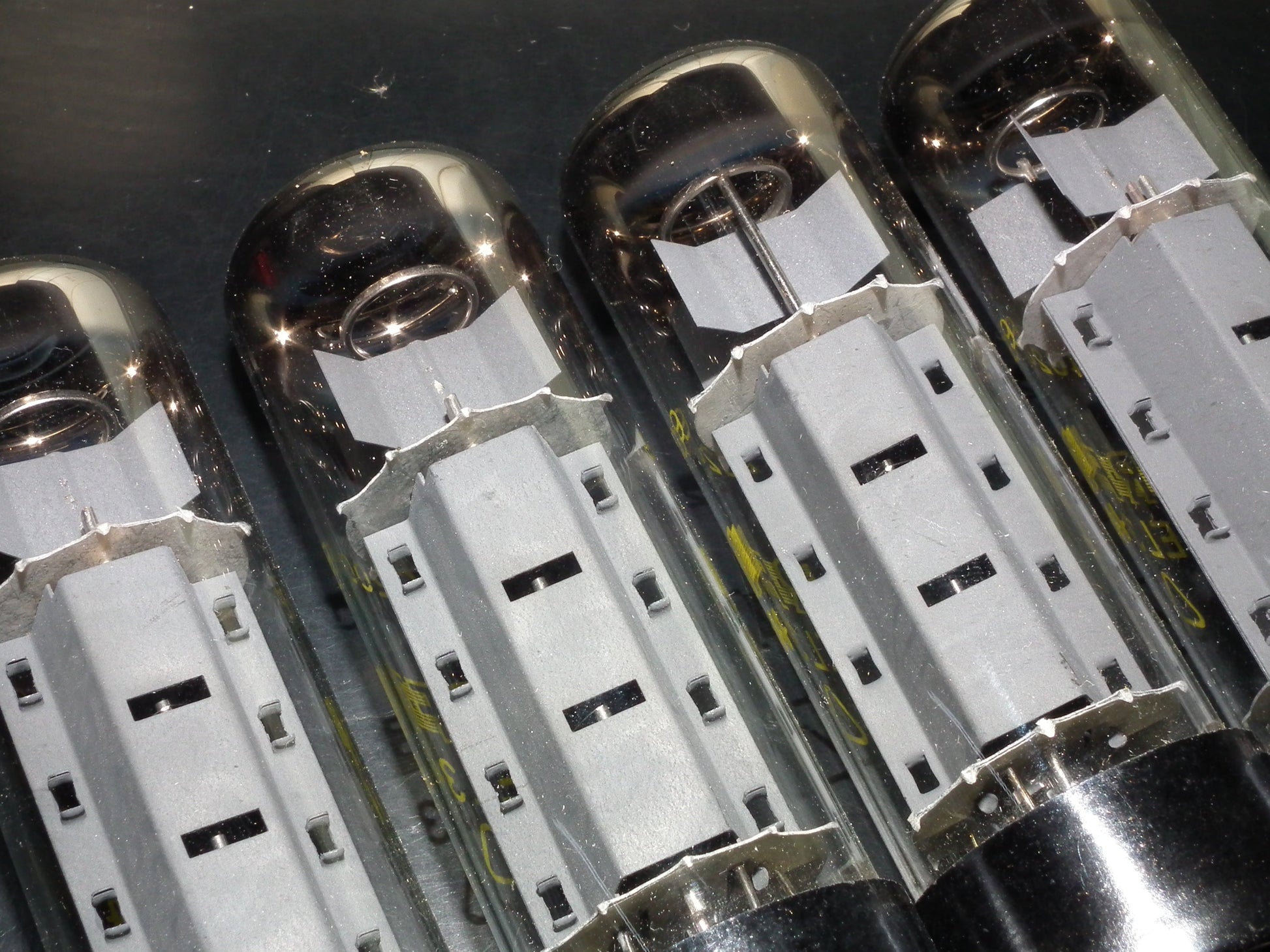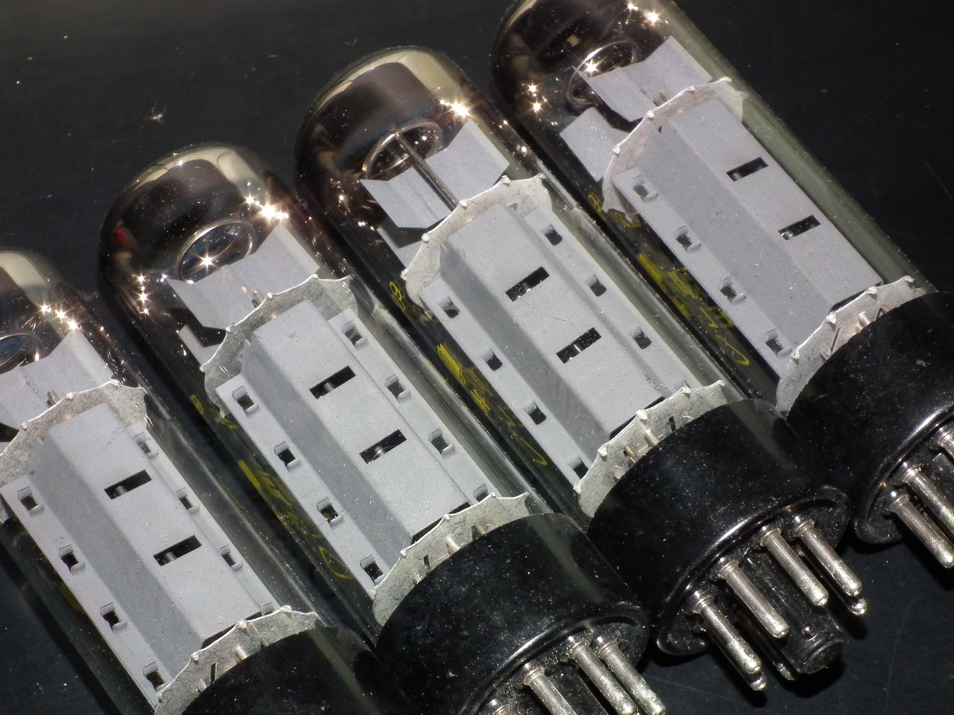 Perfectly matched quad (4 tubes) of genuine EL34 / 6CA7 made by RFT tube factory in Muhlhausen, Germany in 60s.