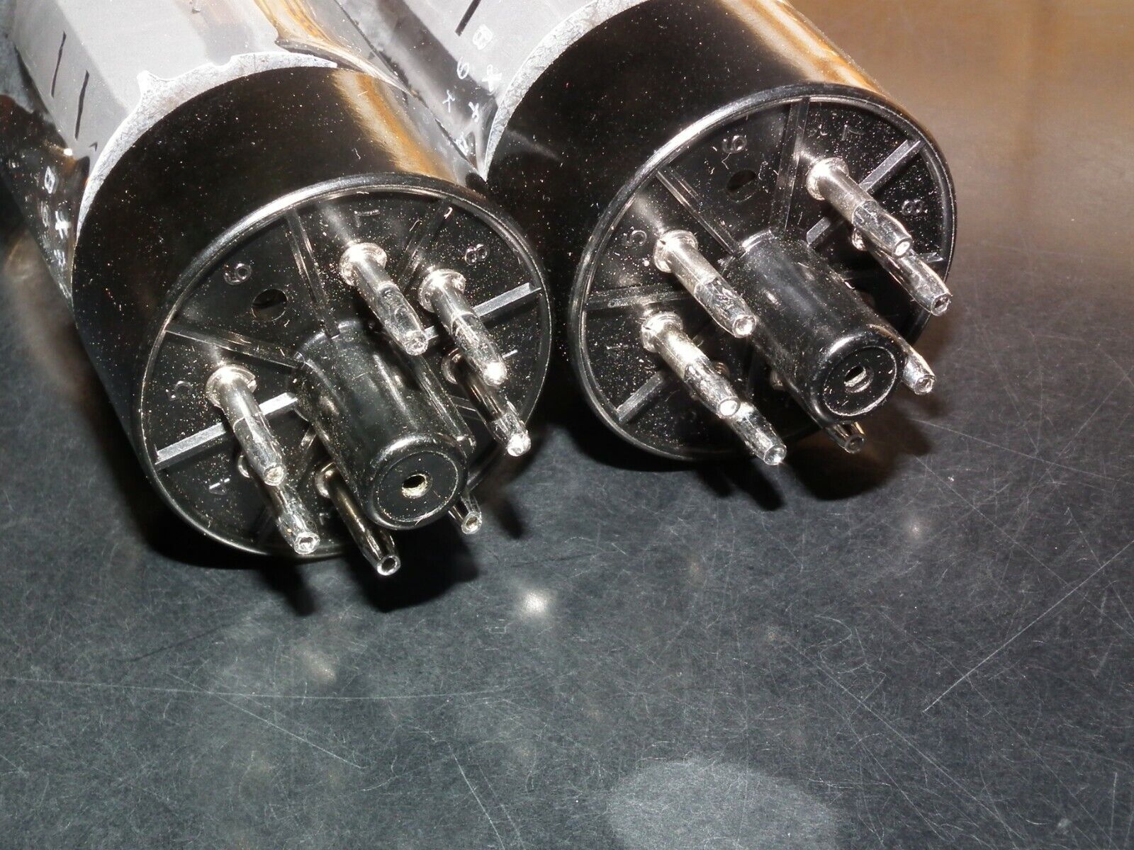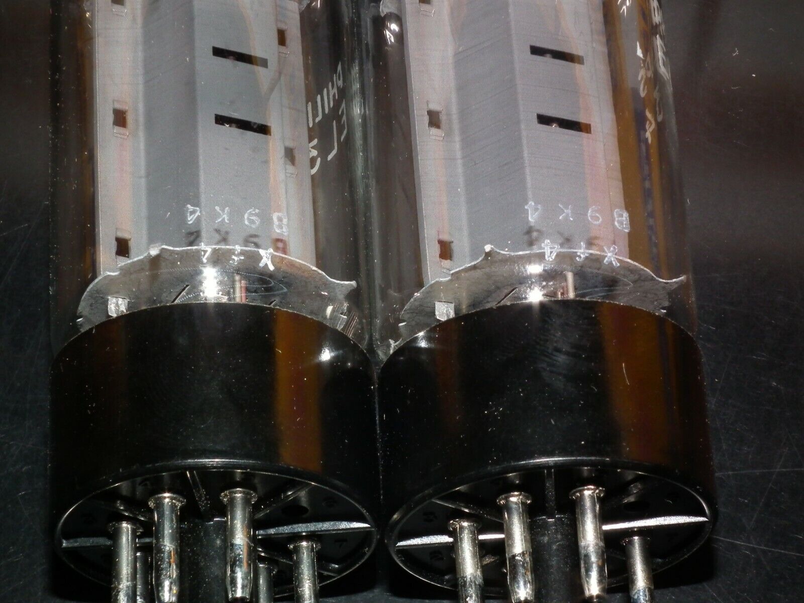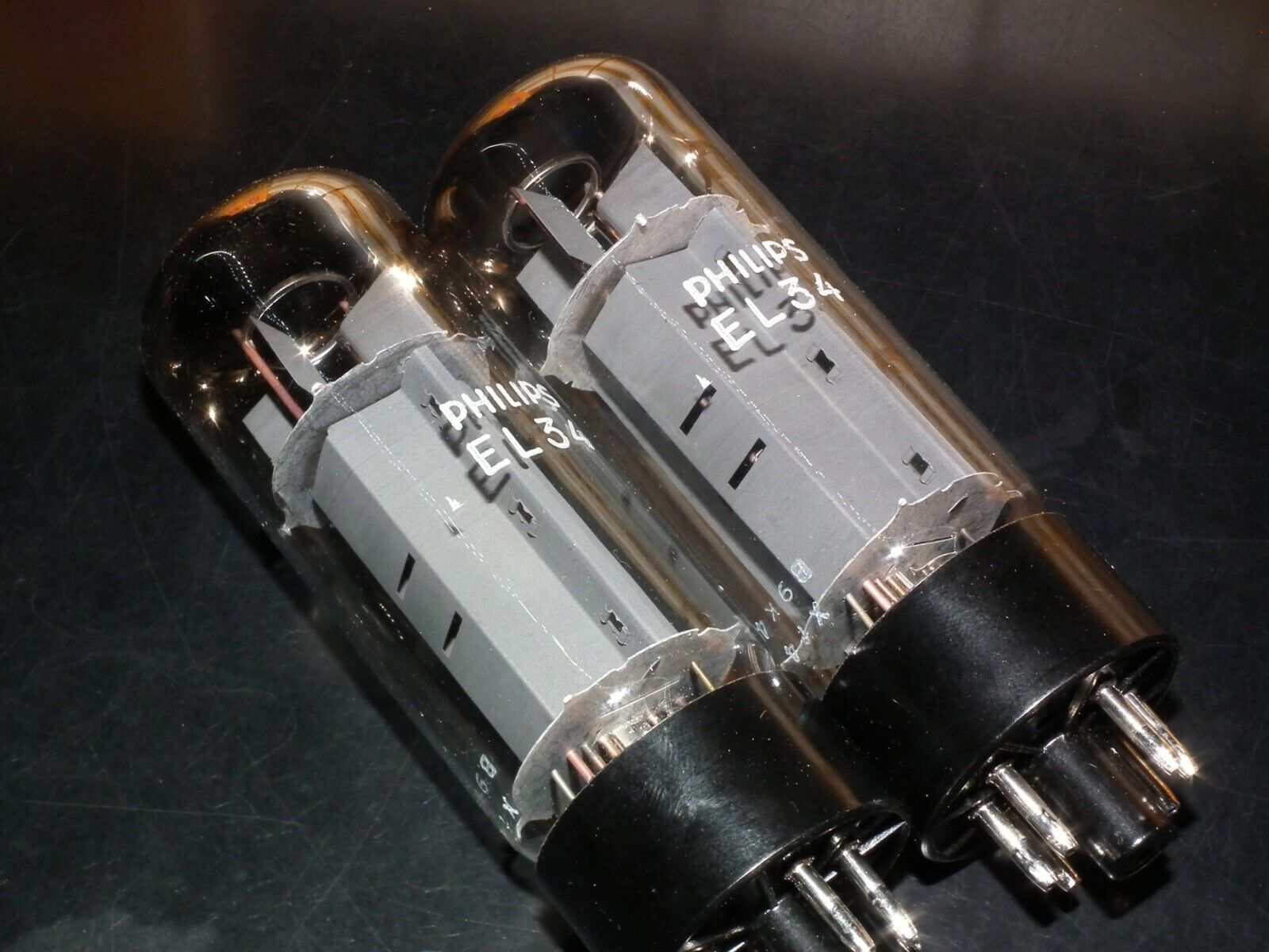 Platinum matched pair (2 tubes) of rare Mullard Blackburn EL34 / 6CA7 Xf4 type, rebranded Philips in genuine yellow Philips boxes.