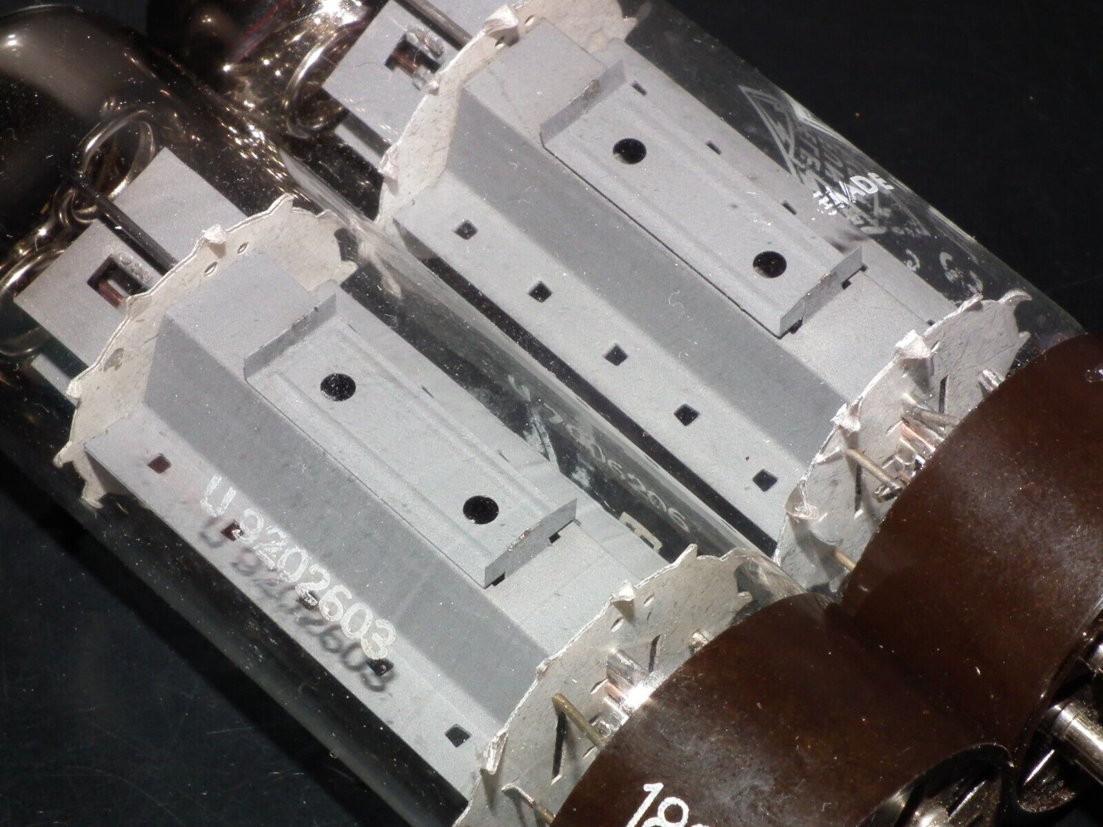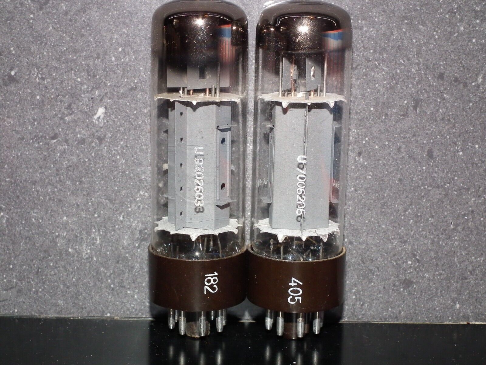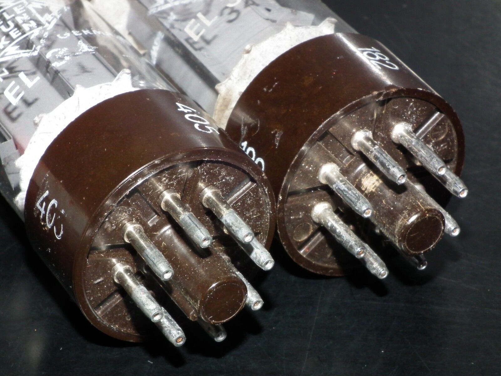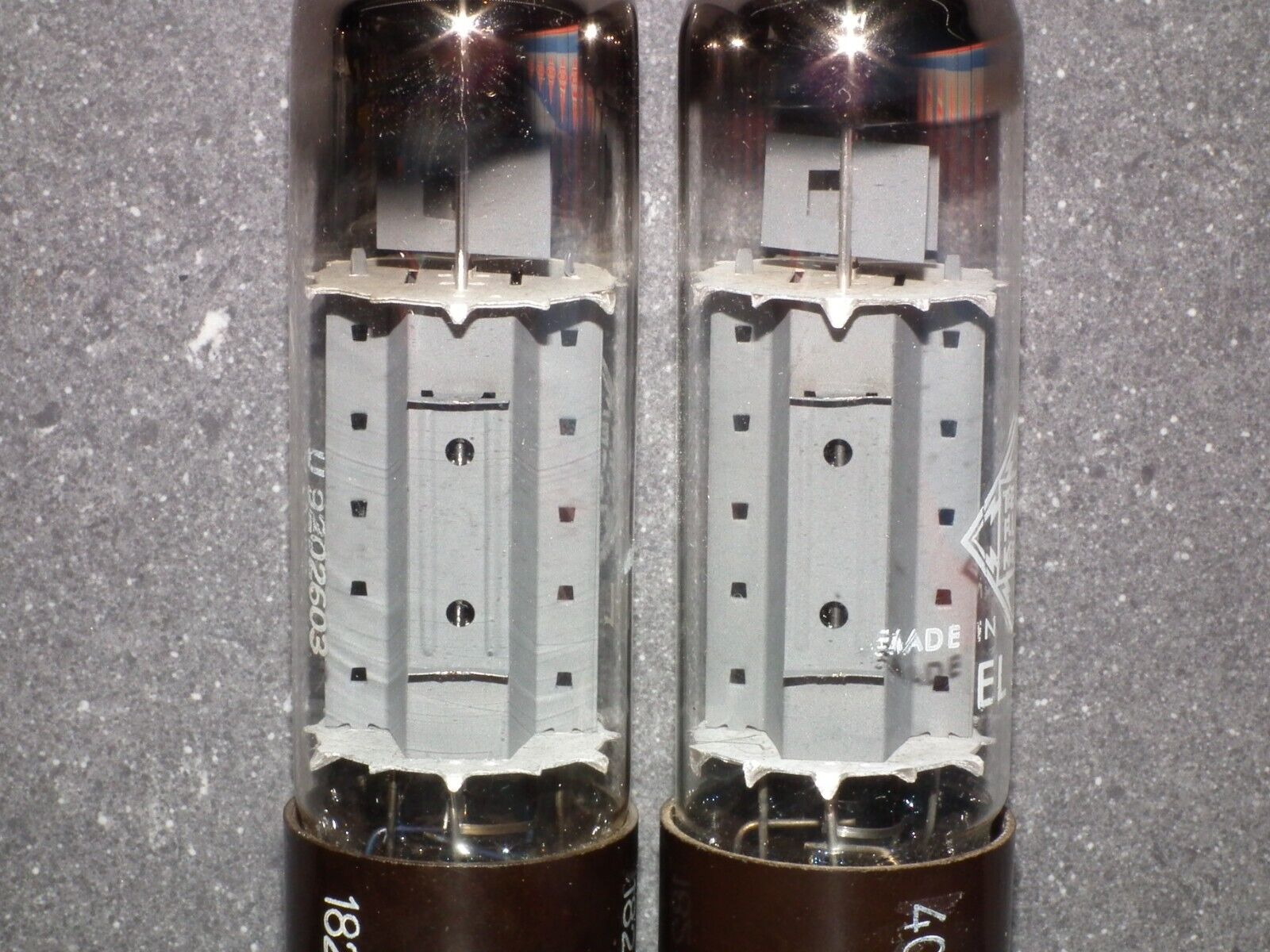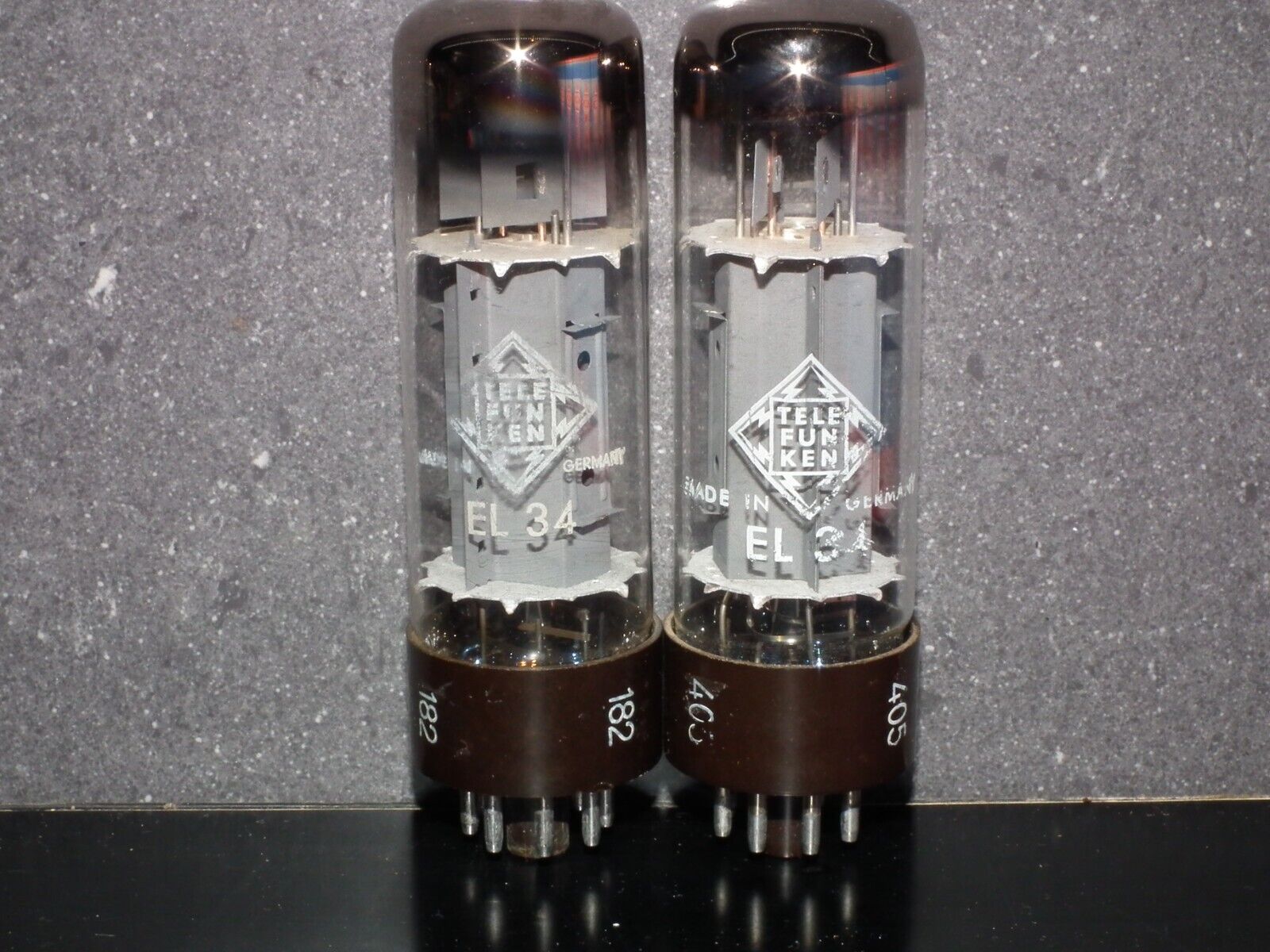 One perfectly matched pair of genuine EL34 / 6CA7 made by Telefunken in Ulm plant in West Germany. Rare OO Getter, brown base, anode heat wings.