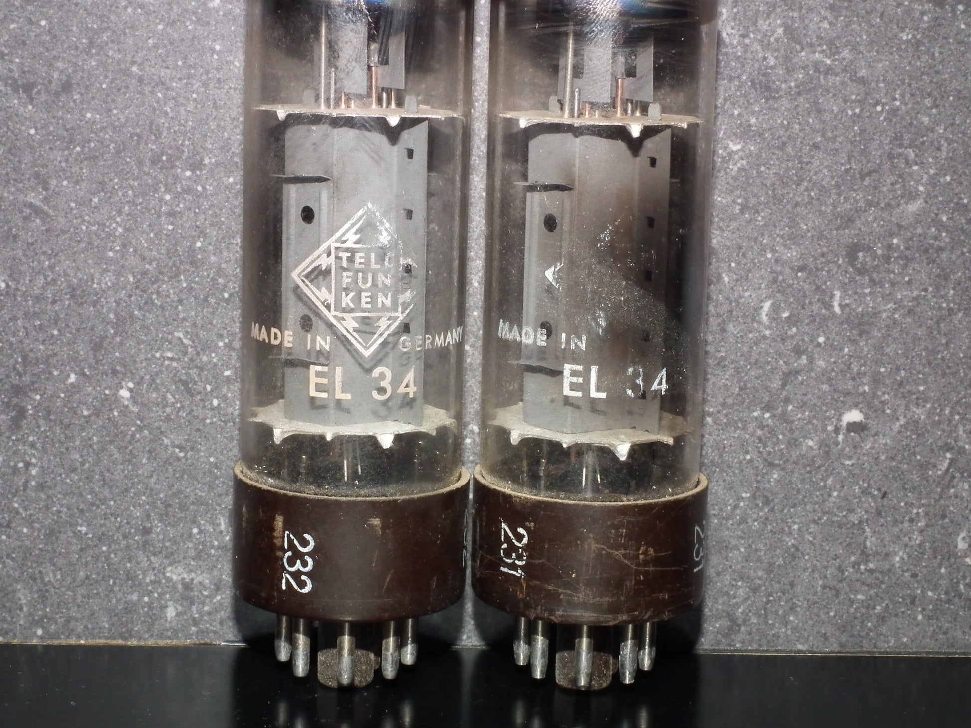 One matched pair of genuine EL34 / 6CA7 made by Telefunken in Ulm plant in West Germany. Rare OO Getter, brown base, anode heat wings.