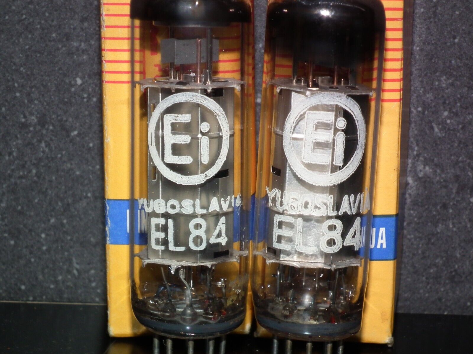 Auction is for one platinum matched pair (2 tubes) of rare EL84 6BQ5 EI Yugoslavia made back in 80s.They are hi quality EL84 pentodes, made under Philips Mullard licence and on original Philips tooling - early version rectangular plate holes, much better sound than later round hole plates. Silver plates, halo ring, copper grid posts. They can be used in all EL84 / 6BQ5 applications.