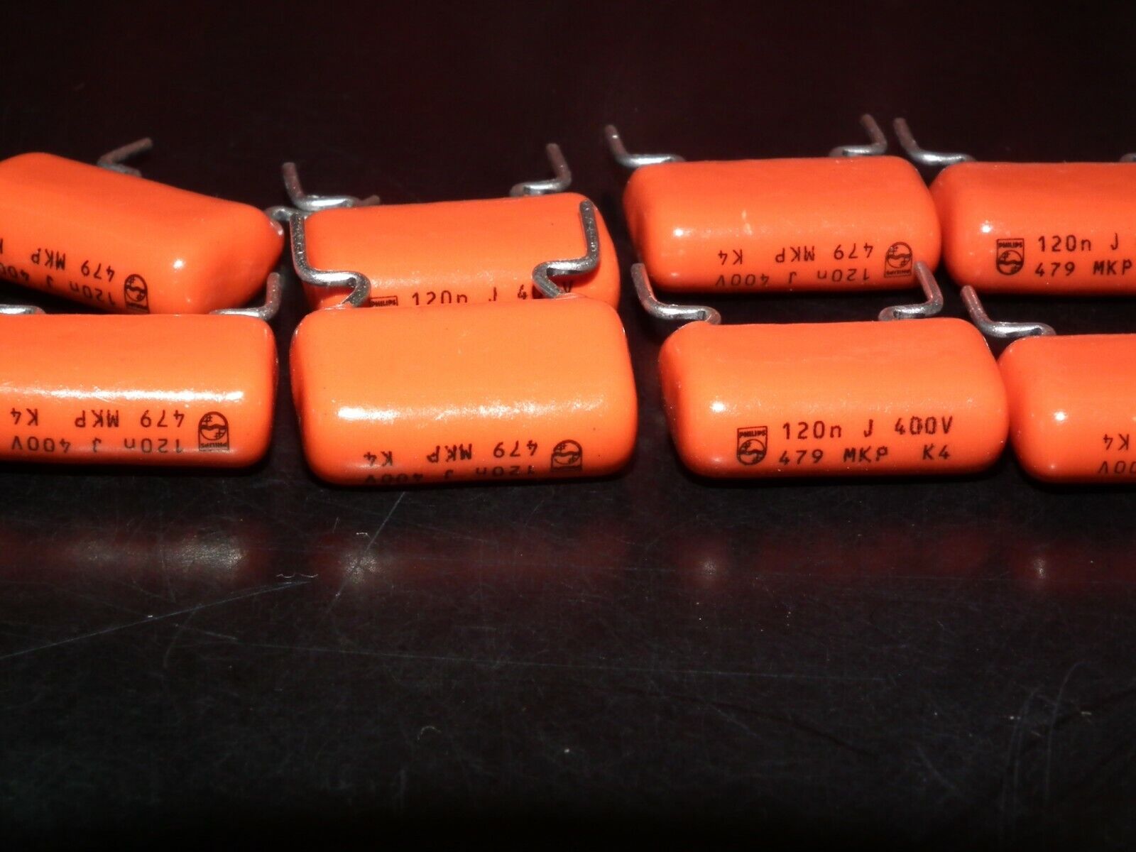 Four (4 pcs) NOS vintage MKP polypropylene film capacitors (Philips Vishay MKP 479), rare and great sounding, ideal for tube amplifiers, made in Belgium by Vishay, from NOS military stock, premium grade, perfect replacement and upgrade for guitar amplifiers and Klangfilm hi end tube audio projects.