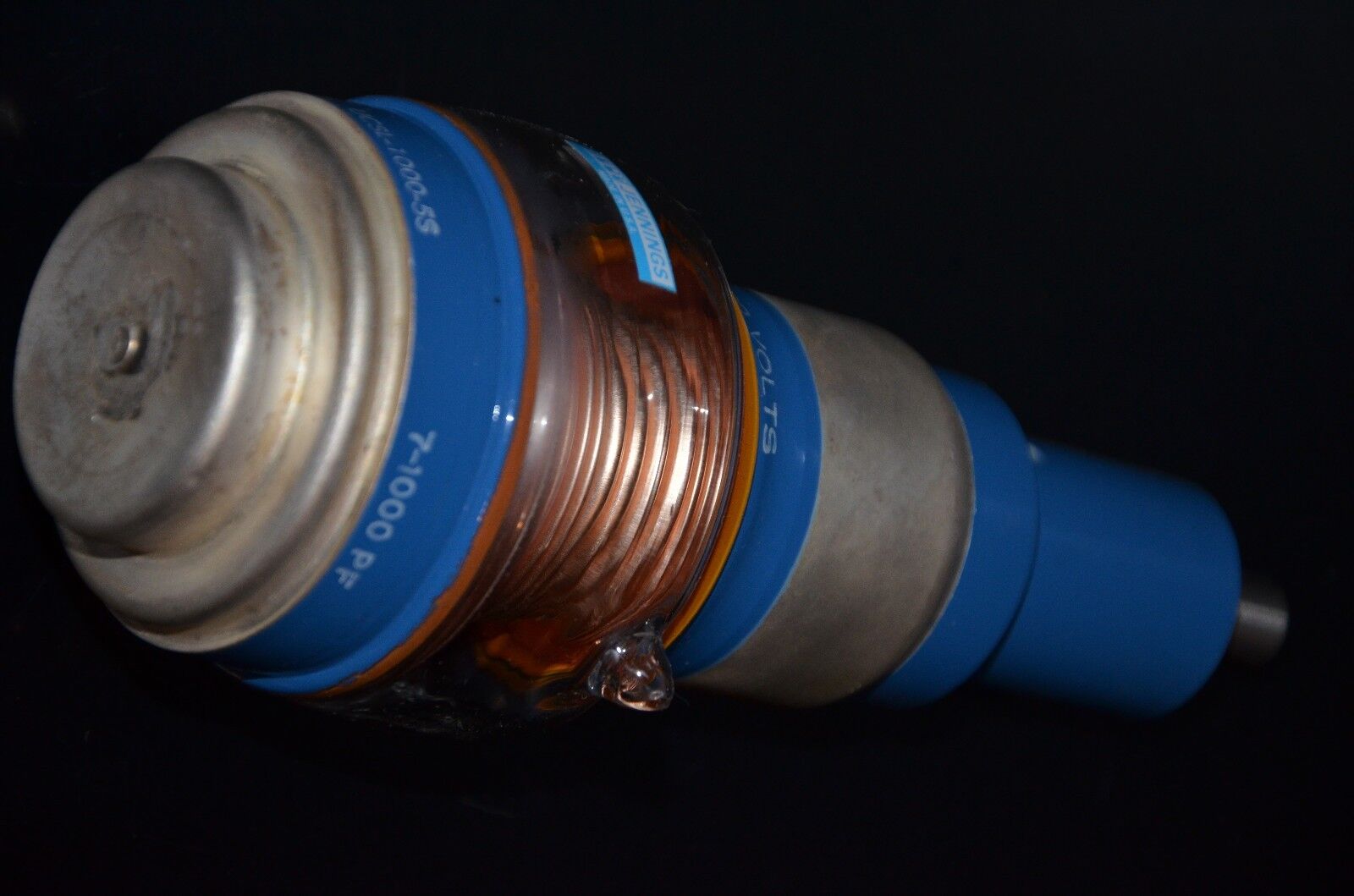 One (1) NOS vintage glass variable capacitor, rare and hi quality, 7-1000 pF / 5KV, ideal for power RF tube amplifiers, made back in 80s in USA, by ITT Jennings, from NOS military stock.