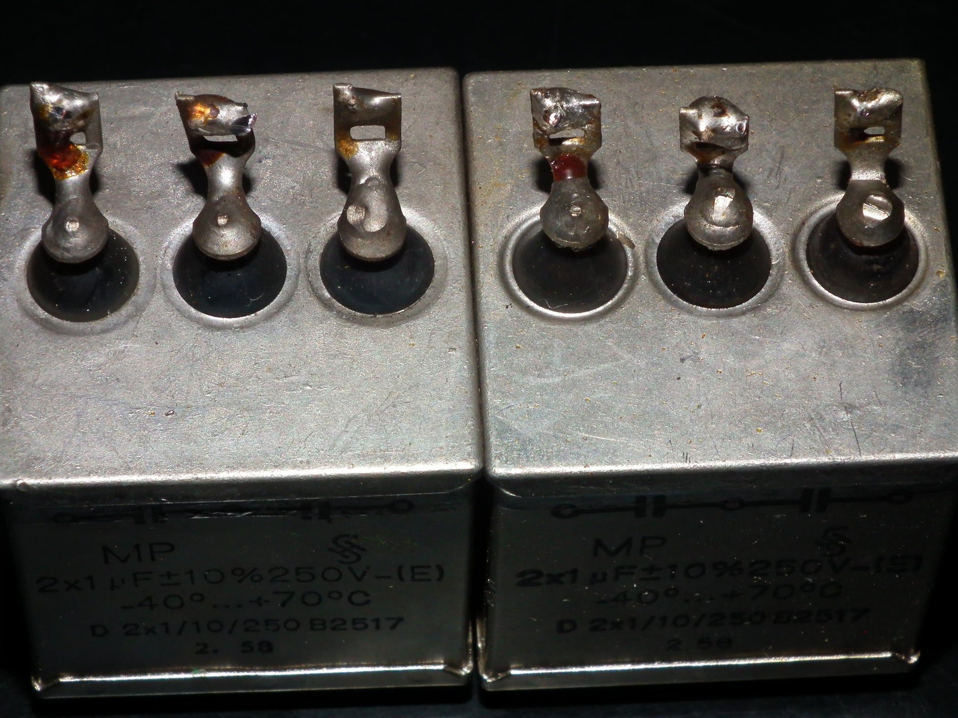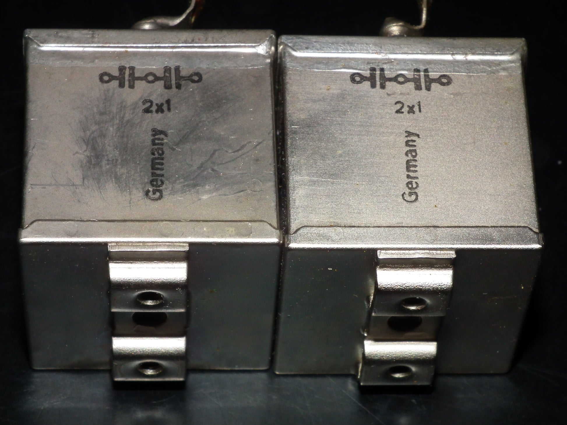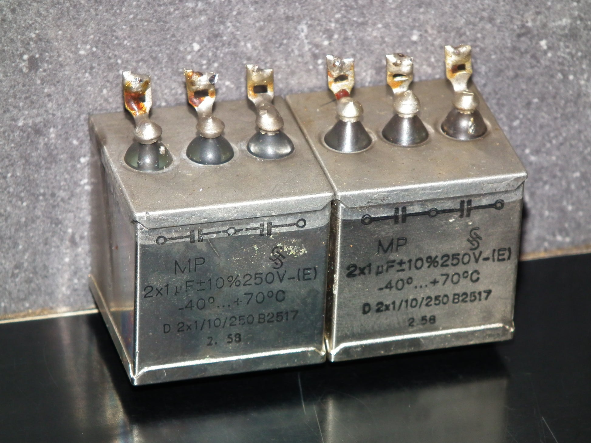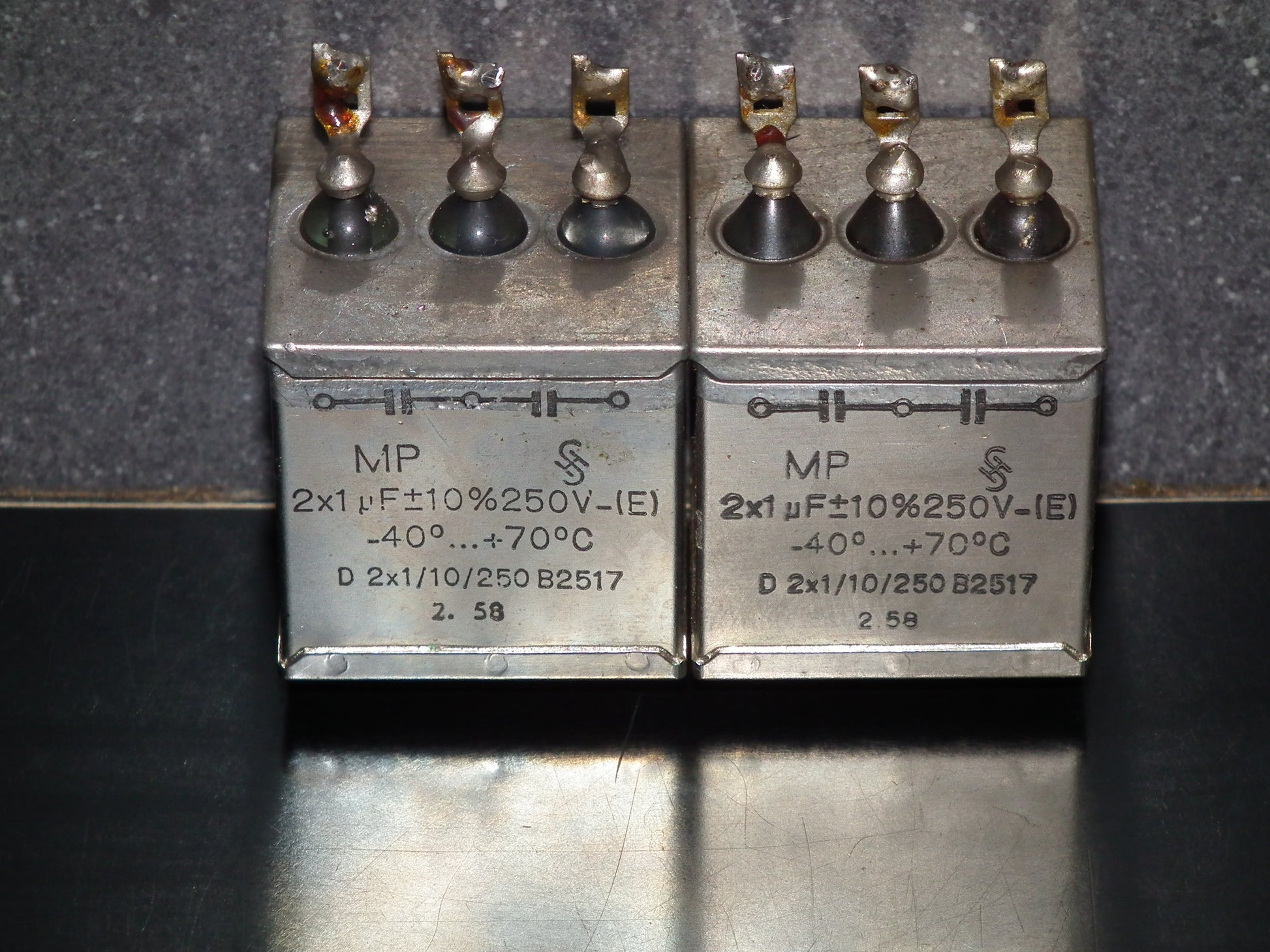 Two (2 pcs) fully tested vintage audio capacitors Siemens Klangfilm 2x1uF 250V, rare and great sounding, ideal for tube amplifiers, made in West Germany in late 50s - early 60s, perfect replacement and upgrade for hi end amplifiers and preamps.