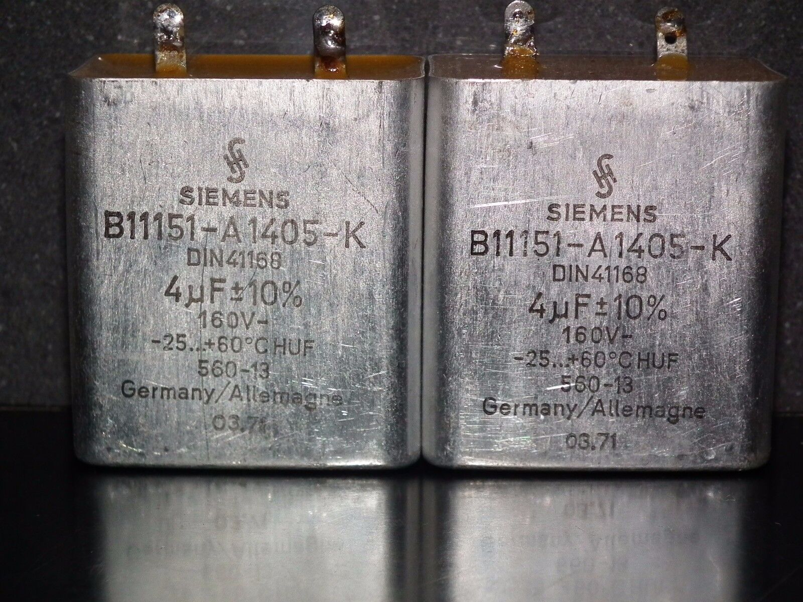 Two vintage Siemens PIO capacitors 4 uF 160V Klangfilm Made in Germany 1971 4mfd